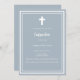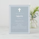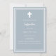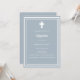Fundo azul empoeirado, decorado com um quadro branco, e uma cruz branca Personalize e adicione o nome e os detalhes. Texto branco.