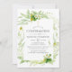 Convite de confirmação verde e branco que inclui samambaias, flores silvestres e morangos e um fundo verde de lavagem com aquarelas sage.
