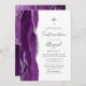 A borda esquerda deste elegante e moderno convite de confirmação apresenta uma cor d'água roxa, borda agitada com falso brilho prateado. Uma cruz de folha prateada falsa aparece acima do texto personalizável, que combina escrita manual, chapa e fontes itálicas em cinzas de carvão em um fundo branco. O verso apresenta um design de agata prateado e roxo correspondente.