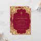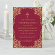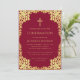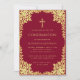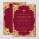 Este convite de confirmação elegante em burgundy e dourado com um ar vintage, recomendado para uma menina, tem uma moldura ornamentada em folha dourada falsa com ramos sinuosos com folhas douradas sobre um fundo burgundy. Acima do texto há uma cruz religiosa em folha dourada falsa. Todo o texto pode ser personalizado e tem uma cor amarelo-dourado semelhante à moldura de ouro falso.