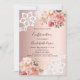 Um convite de confirmação elegante. Um fundo rosa de gradiente dourado decorado com florais, rosas, rendas e uma cruz de ouro cor-de-rosa e rosa. Personalize e adicione um nome e detalhes.