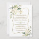 Design de cartão elegante, com flores brancas delicadas e folhas verdes, cor d'água, cor azul fina, com cruz e armação brilhantes, divisor floral, sobre fundo branco. Nas costas, buquês de flores brancas e cruz de ouro. Use a ferramenta Personalizar para adicionar suas informações, alterar fontes, cores da fonte. Para itens correspondentes, visite minha Coleção de Confirmação.