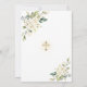 Design de cartão elegante, com flores brancas delicadas e folhas verdes, cor d'água, cor azul fina, com cruz e armação brilhantes, divisor floral, sobre fundo branco. Nas costas, buquês de flores brancas e cruz de ouro. Use a ferramenta Personalizar para adicionar suas informações. Para itens correspondentes, visite minha Coleção de Confirmação.