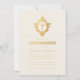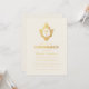 Este convite de confirmação de marfim e dourado, neutro em termos de gênero, com um ar vintage, tem uma crista floral antiga com uma cruz, ambos em folha de ouro falso. O nome está escrito em uma elegante caligrafia. O texto tem uma cor dourada semelhante à crista em ouro falso. O fundo é marfim, quase branco.