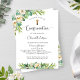 Convite de confirmação Elegante com detalhes florais elegantes de cor aquosa verde e elementos caligráficos modernos escritos à mão, tanto na frente como no verso. Sexo Convite neutro, ideal para confirmação de menina ou de garoto. Voltar com o quadro do estilo do logotipo moderno do canto com o nome e a data de confirmação do seu filho. Folhagem verde e flores numa bela mistura de cinzas verdes, brancas, amarelas e douradas. Estilo elegante, moderno e fresco.