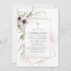 Convite de confirmação com flores anêmonas e folhas de eucalipto em moldes geométricos de ouro rosa.