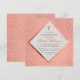 O texto está em uma moldura quadrada rosa dourado (falso metálico) e tem uma cruz rosa dourado acima dela. O nome e a palavra "Confirmação" estão coloridos em uma cor rosa-marrom semelhante ao rosa dourado. O nome é escrito em uma fonte caligráfica elegante, o restante em maiúsculas. O fundo (e a parte de trás) é rosa dourado com glitter, o interior da moldura é mármore branco.