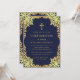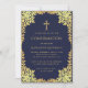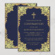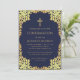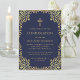 Este convite de confirmação azul-marinho elegante com um toque vintage, recomendado para um menino, tem uma moldura ornamentada em folha de ouro falso com folhas douradas sobre um fundo azul-marinho. Acima do texto há uma cruz religiosa em folha de ouro falso. Todo o texto pode ser personalizado e tem uma cor amarelo-dourado semelhante à moldura de ouro falso.