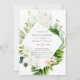 Verde cor-de-rosa pincelado e tropical de verão a confirmação floral convida orquídeas brancas, proteas rebeldes brancas, magnólias, eucalipto e verde profundo.