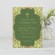 Este elegante convite de confirmação verde e dourado com um ar vintage tem um quadro de folha de ouro falso em ornamentado com folhas de ouro em fundo verde. Acima do texto, há uma cruz religiosa em folha de ouro falsa. Todo texto pode ser personalizado e tem uma cor amarela ouro semelhante à imagem falsa dourada. A safra, ornamentado de folhas de ouro é baseada em um antigo enlace de cobrir de livros, "O século XVIII Suas Instituições, Alfândegas e Figurinos" de Paul LaCroix, publicado em 1876, agora no dominio público.