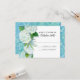 Com arte original pintada à mão e desenhada graficamente por Audrey Jeanne. Cartão de resposta de confirmação de presença para convites de casamento. Criado em estilo vintage, mas com arte recém-criada de espirais de damasco em tons de azul, desde aqua até azul celeste. Flores brancas de hortênsia caem ao longo da borda do painel lateral do design. Direitos autorais, Audrey Jeanne Roberts.