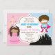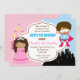 Convite dividido para gêmeos/irmãos, no tema duplo/duplo: princesa e super-herói com rapaz e menina africanos.