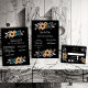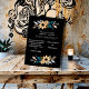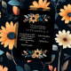 Esta design do cartão de casamento apresenta um arranjo floral encantador com girassóis e folhagem complementar, tudo colocado sobre um fundo preto elegante. O design é dividido em dois clusters, um no topo e outro no fundo, criando um quadro equilibrado para o texto central. Os girassóis, com as pétalas cor de laranja quente e os centros escuros, são cercados por folhas azuis e cinzas, junto com sotaques de pêssego macios, acrescentando um toque de elegância rústica. A estética em geral é uma mistura de sofisticação moderna e beleza natural, fazer ideal para um casamento com um tema contemporâneo, porém terrestre. Personalize o cartão com seus nomes e detalhes do casamento. Você pode baixar a placa para seu dispositivo móvel ou computador. O cartão foi criado com a ajuda do ai.