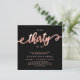 O Elegante Chic Fala 30 Para Mim Escrever Um Convite A aniversário de 30 anos Preto e Dourado Rosa. Este moderno modelo de convite de aniversário para mulheres apresenta o texto "Talk Third To Me" em um grande falso roteiro de ouro rosa robusto, escrita à mão, com letra maiúscula, com letra maiúscula, e detalhes da festa em cor ouro rosa em preto. No lado inverso, o padrão de círculo de onda oscilante da folha rosa de ouro falso em forma de película de ouro em preto. Perfeito para comemorar, giramente, trinta dias de aniversário em estilo, este convite adiciona um toque de glamour a qualquer partido feminino.