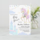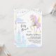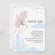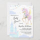 Cartões de convite de chá de fraldas plano com um unicórnio fofo com asas, bandeiras e um castelo.