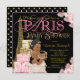 Convites para bebês em Paris com uma bela Torre Eiffel de ouro, pacotes elegantes de presentes em Paris, doce menina africana-americana vestindo uma roupa rosa e preta e bereta e cordas de pérolas com rico rosa escrito em Paris em um rico fundo floral rosa. Este belo convite para o chá de fraldas de Paris é facilmente personalizado para o seu evento, simplesmente adicionando os seus detalhes no estilo de letra e cor, e a redação da sua escolha.
