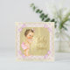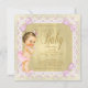 Convite de chá de bebê rosa e dourado com belo fundo dourado e linda princesinha usando calças rosa franzidas e colar de pérolas sobre um lindo e elaborado fundo de renda rosa e dourado com laço. Este adorável convite de chá de bebê rosa e dourado é facilmente personalizado para o seu evento adicionando os detalhes do evento, estilo de fonte, tamanho e cor da fonte e texto. Este é um design impresso sem nenhum tipo de folha, brilho, joias, laços, etc.