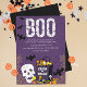 Convide pequenos fantasmas e goblins para uma doce e assustadora celebração do Dia das Bruxas com este convite de festas roxo divertido. Apresentando a palavra "BOO" soletrada em letras fantasmas bonitinhas, morcegos voando por, uma ilustração do crânio, teias de aranha, e um saco cheio de doces — é perfeito para uma festa de fantasia para crianças ou evento de truque ou tratamento. Personalize o texto com os detalhes do seu partido para uma reunião terrivelmente divertida!