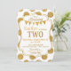 Impressão de pontos brancos e dourados com aspecto brilhante com sinal de banner de aniversário sobre um design de cartão de convite de aniversário dourado com duas letras.