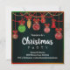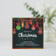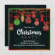 Um convite de festas de Natal festivo, com decorações de Natal penduradas e ornamentos de árvores de Natal em vermelho, ouro e verde em cores de Natal, tudo sobre um fundo preto dramático para fazer os ornamentos realmente pop. Todos os detalhes podem ser personalizados para se adequarem à sua própria celebração.