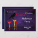 Uma ilustração gráfica de cocktails brilhantes e de cor branca sobre um fundo de casa de corvos pelo artista/designer Charmaine Paulson num convite do Festa de Halloween. ©2013charmanepaulson