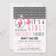 Um convite de chá de fraldas com uma borda superior de um som com um tom cor-de-rosa. Pino de fralda rosa conectado à borda superior e forma circular com dentro de carruagem de bebê rosa. Personalize o texto rosa e preto com detalhes da sua ocasião.