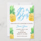Este é um convite para chás de fraldas tropicais de abacaxi Tem 4 abacaxi no design e diz "é um menino" na frente Perfeito para uma festa de chá de fraldas tropical