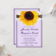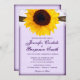 Modelo de Convite para Casamento Rústico de Girassol Roxo Este anúncio de casamento único apresenta um fundo púrpura claro e angustiado em ambos os lados do convite. O convite tem um embelezamento de rendas impresso e ornamentação de fios. Além disso, há um girassol amarelo brilhante, frente e centro no topo do convite. O rendas e o fio são apenas designs impressos. Não é um lugar ou fio.
