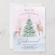 Um gênero de bebê de inverno revela convite de festas. O design de Natal apresenta um cervo e um veado em uma cena de neve de inverno em aquarela cercado por árvores de Natal decoradas com bolhas azuis e cor-de-rosa.