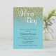 Belo convite para chá de bebê borrifador azul e dourado. Design por Caroline Leskiw