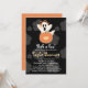 "Olhem para um boo!" chora o doce fantasma vestindo uma fita laranja e arco flutuando atrás de uma bolinhas de abóbora entalhada voando através do céu nublado. Estes convites temáticos de halloween são perfeitos para um chá de fraldas de outubro para uma menina. Trabalho de arte © Chrissy H. Estúdios, LLC. Todos os direitos reservados.