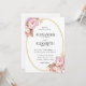 O convite para o casamento exibe uma oval central, formada por um anel duplo de linhas de ouro, com aglomerados de peões cor-de-rosa e suas folhagens enfeitando as bordas superior e inferior, criando um arco floral elegante em um pano de fundo branco.