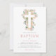 Um belo convite batismo para sua filha com uma cruz branca com bonito flores rosa e folhas verdes para trás, como ponto focal. Personalize com seus detalhes em rosa e cinzas.
