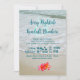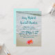 Bordo do convite de casamento da tipografia do mar com linhas de texto divertidas. Os nomes do casal no topo estão em um script grande sobre um "e assinar" grande. O texto é azul escuro sobre uma imagem de fundo da areia lisa da praia e da água chegando a terra. Duas flores cor-de-rosa brilhante de frangipani decoram a parte inferior do papel. Este convite é perfeito para uma cerimônia ocasional à beira-mar e também vem como um download instantâneo.