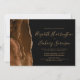 A borda esquerda deste elegante convite de casamento moderno apresenta uma mocha castanha de aquarela agata bordada com falsa brilho dourado. O texto personalizável combina manuscrito dourado, fontes em copperplate e itálico em um fundo fora de preto. O verso apresenta um design de agata marrom e dourado correspondente.