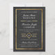 Convites de casamento sobre um falso efeito de folha de ouro e branco contra um fundo preto texturizado sutilmente no quadro. Script clássico e fontes serif. Um simples efeito de deco de arte na data do casamento. Note-se que a folha de ouro é um efeito impresso - nenhuma folha metálica será utilizada no convite.