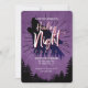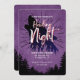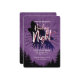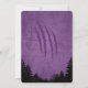 Este convite apresenta um fundo roxo assustador, uma silhueta de lobo uivante e as palavras "Howling Night Party". O design é ousado e expressivo, com uma fonte de estilo manuscrito que empresta um toque pessoal e informal. A silhueta do lobo uivante é uma imagem poderosa e evocativa que transmite imediatamente a natureza assustadora e temática do Halloween do evento. O fundo da floresta adiciona profundidade e atmosfera, enquanto as linhas radiantes criam senso de movimento e energia. A parte de trás do cartão tem um fundo roxo escuro com a silhueta de uma floresta no fundo. Marcas de garra proeminentes são riscadas através do centro da imagem, acrescentando uma sensação de perigo e mistério.