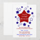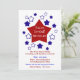 Uma grande estrela vermelha enquadra as palavras: Você foi convidado em 4 de julho. Ao redor da estrela vermelha estão estrelas brancas com bordas azuis e estrelas azuis sólidas nas cores patrióticas da bandeira americana. Este é um design excelente de para convites para barbeques de férias de quintal, bolachas e piquenique para celebrar o Dia da Independência em 4 de julho.