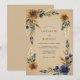 Deep navy blue and warm copper watercolor blossoms create a striking contrast against a textured tan background. Detailed roses and anemones are paired with soft sage green leaves and delicate white sprigs. This design captures a rustic autumnal atmosphere, ideal for an earthy woodland-themed event.