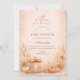 A warm and cozy fall baby shower design featuring a hand-painted watercolor pumpkin surrounded by soft peach florals, golden leaves, and delicate autumn accents. The earthy orange palette and elegant arch layout create a refined harvest aesthetic that feels timeless and inviting. Perfect for an autumn celebration, a neutral fall theme, or a charming “Little Pumpkin” baby shower with rustic floral details.