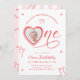 Celebrate your little one’s first birthday with this coquette-inspired heart invitation, featuring delicate pink bows, sweet hand-drawn details, and a romantic Valentine-style design.