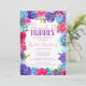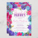 As flores azuis brilhantes, as rosas roxas profundas e as flores tropicais cor-de-rosa magenta criam uma vibrante estrutura floral. Brunch & Bubble é escrito em uma combinação de tipografia roxa e rosa moderna de tendências, de script simples e tipo negrito. A parte de trás do convite é tão ousada e colorida quanto. Este convite faz parte da Coleção Azul Púrpura Cor-de-Rosa Negrito.