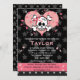 Este o gótico contudo os convites de festas de aniversários femininos do crânio têm um crânio que vestem um arco cor-de-rosa com crossbones atrás de sua cabeça em um coração cor-de-rosa e em um fundo preto e do cinza das estrelas. O splatter do grunge do rosa quente e das cinzas e falso couro e parafuso prisioneiro da prata projeta completo este punk rock customizável e o aniversário gótico do estilo convida. Trabalhos de arte e © Chrissy H. Estúdio do design, LLC. Todos os direitos reservados. Personalize o texto para dizer o que quer que você quer.