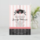 Estes convites bonitos do chá de fraldas da aranha são mais doces do que assustadores. Uma aranha do bebê com um pacifier em sua boca e um arco cor-de-rosa em sua cabeça deixa cair para baixo da parte superior deste chá de fraldas listrado cor-de-rosa, preto e branco do Dia das Bruxas convida. © Chrissy H. Estúdio dos trabalhos de arte, LLC. Todos os direitos reservados.