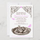 Os convites cor-de-rosa do tea party do jardim caracterizam um grupo e borboletas de chá com um encabeçamento floral do rolo e padrões do ornamentado em cor-de-rosa, em marrom, e o branco.