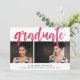 Um anúncio e convite de festas modernos de graduação com dois de seus retratos favoritos de mais velho ou fotos de graduação alinhadas lado a lado, com o "formando" como uma cobertura em letras brilhantes, cor-de-rosa, gravadas à mão. Personalize o lado frontal com o nome do formando, a escola e o ano de aula, e adicione seus detalhes de festa de formatura ao backer listrado.