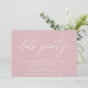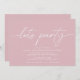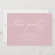 Convites simples e modernos de aniversário com texto de título lendo "vamos party" em script. Adicione os detalhes do evento abaixo. Texto branco sobre fundo rosa pastel.