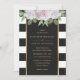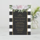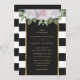 Convites florais elegantes, com rosas rosa pinceladas, sobre fundo listrado preto e branco.