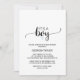 Este simples cartão de convite para caligrafia negra "é um menino" é perfeito para um chá de fraldas rústico ou moderno. A design minimalista de um bebê apresenta a tipografia moderna e um sutil coração azul pastel. O suporte apresenta um padrão clássico de folhas e ramos.
