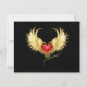 coração vermelho vivo de um anjo com asas de ouro brilhando no fundo vermelho-radiante escuro decorado com um padrão.